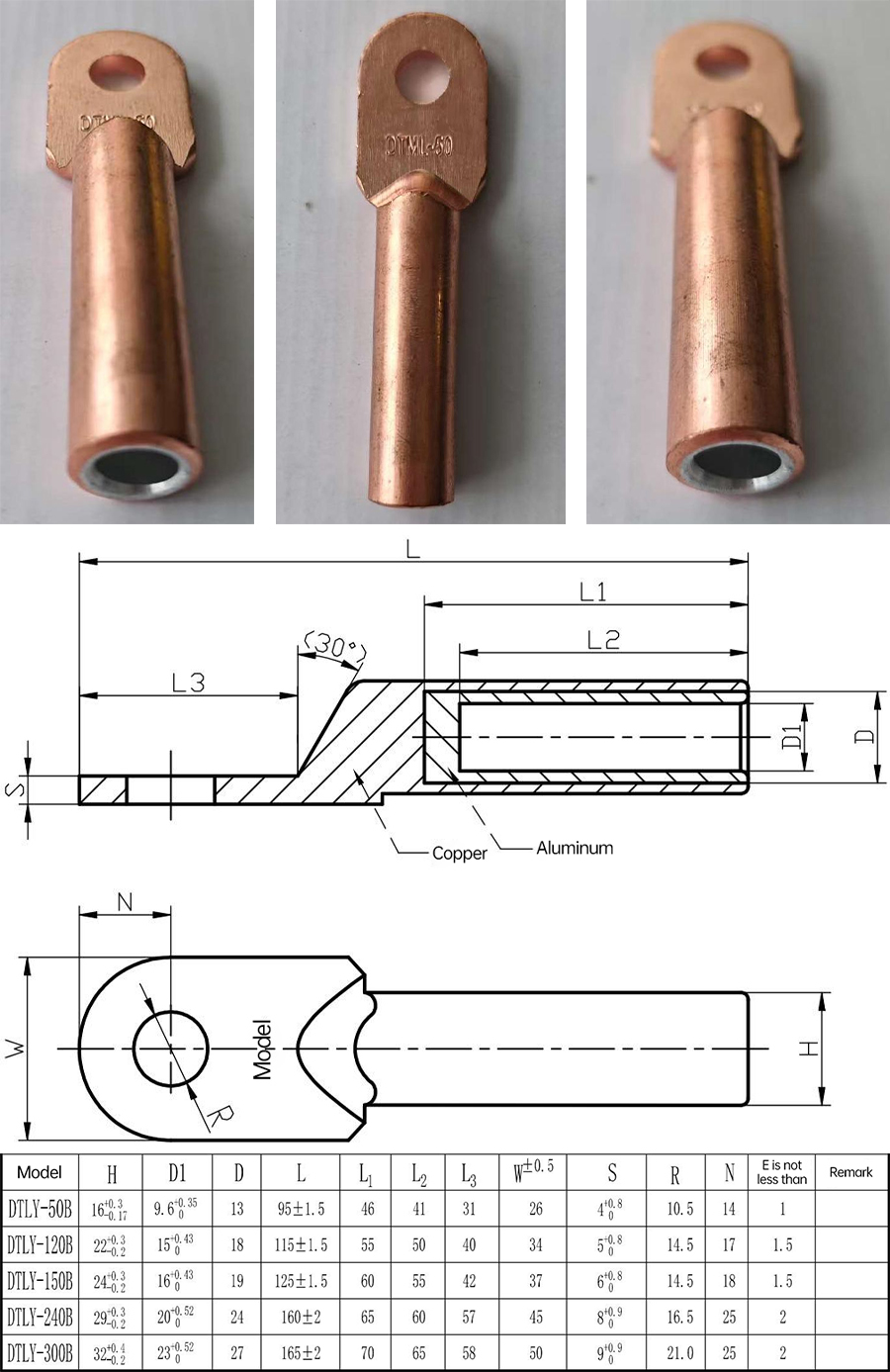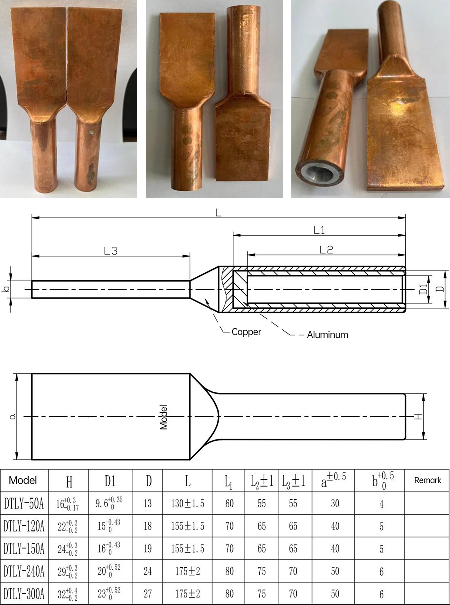 Product model and name: DTLY-XXX-A, DTLY-XXX-B type integrated copper-aluminum transition terminal.